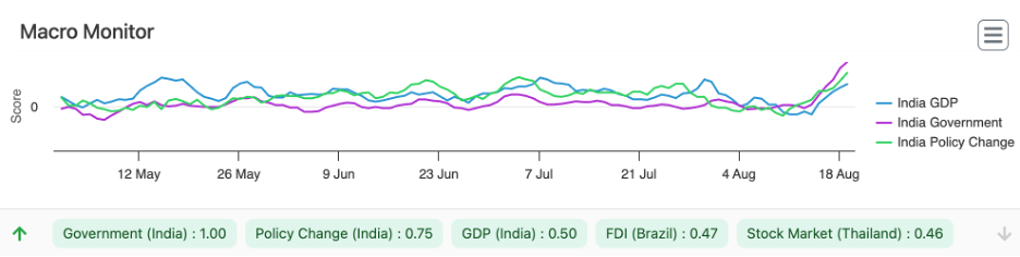 Fig. 1: EMAlpha’s Multilingual AI inspected local Indian media and used local language sentiment analysis to detect sentiment scores for various macro themes. The scores are normalized such that +1.00 signifies extreme optimism and -1.00 signifies extreme pessimism.