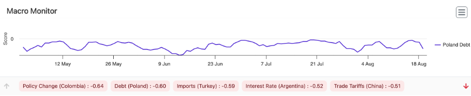 Fig. 2: EMAlpha’s Multilingual AI inspected local Polish media and used local language sentiment analysis to detect sentiment scores for various macro themes for the country. The scores are normalized such that +1.00 signifies extreme optimism and -1.00 signifies extreme pessimism.